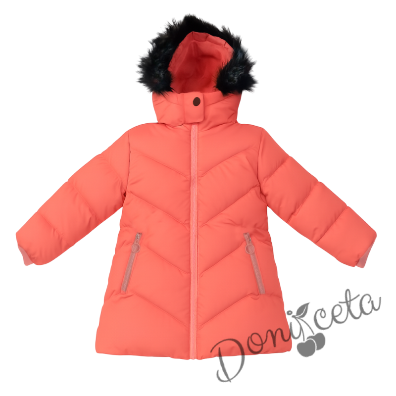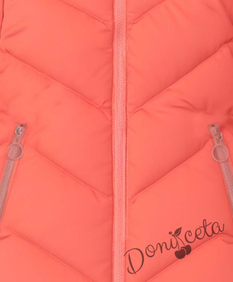- Стилно зимно яке в цвят корал с качулка с пух.