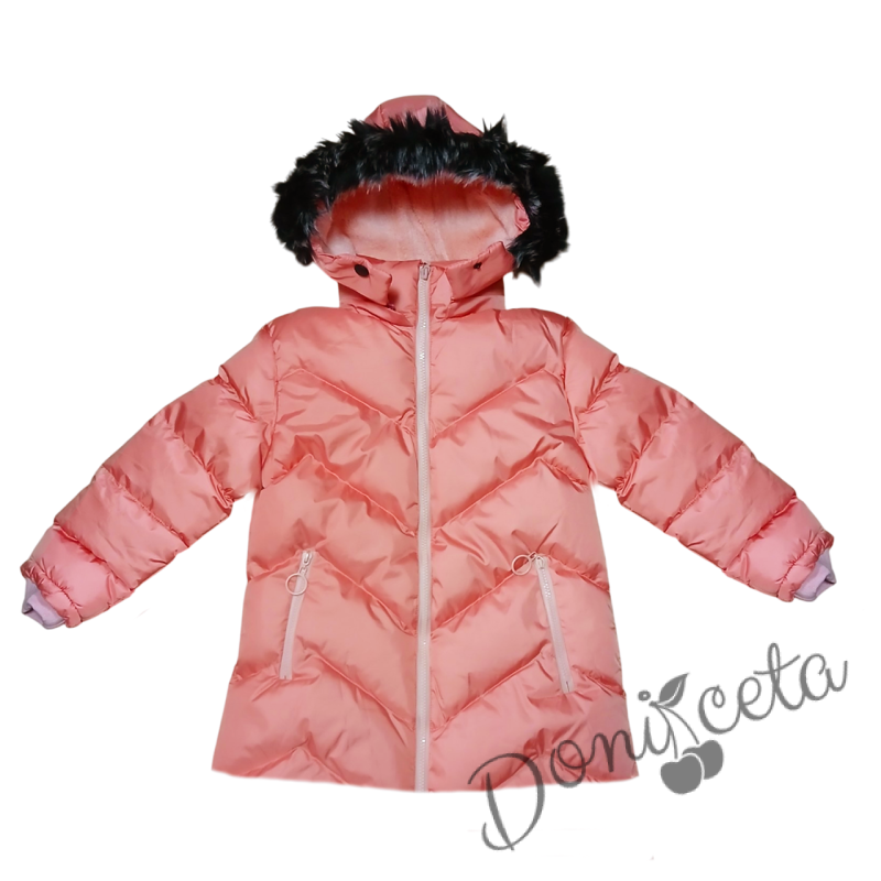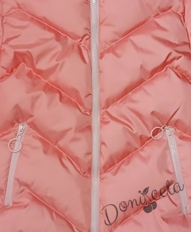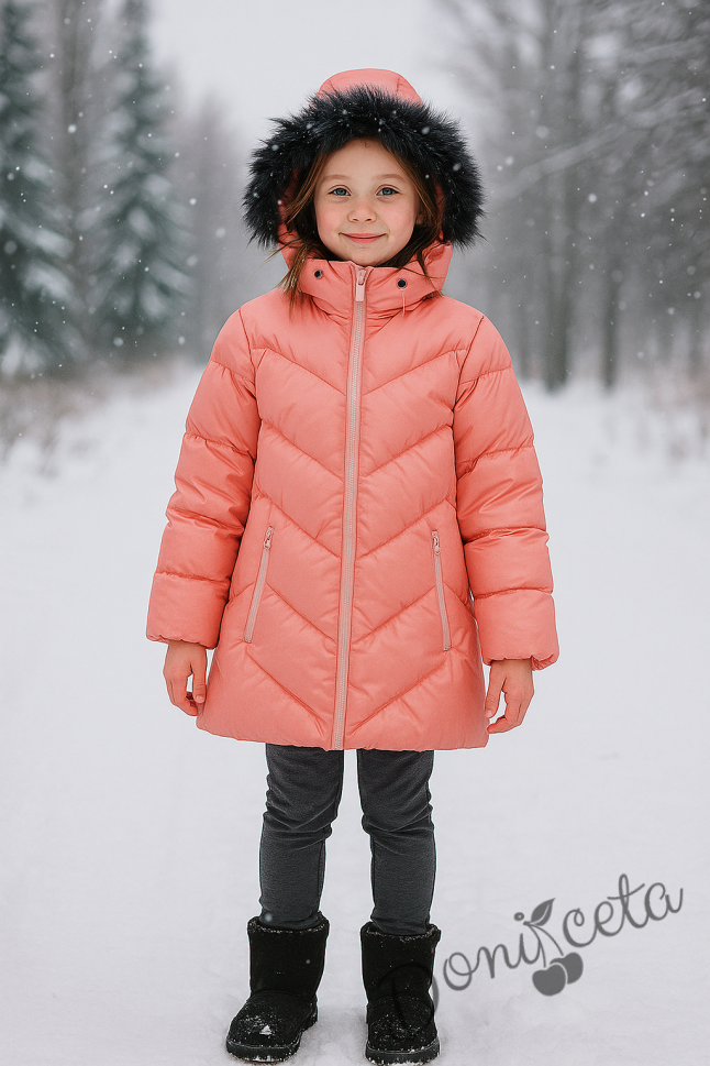 Детско зимно яке за момиче с качулка в цвят корал