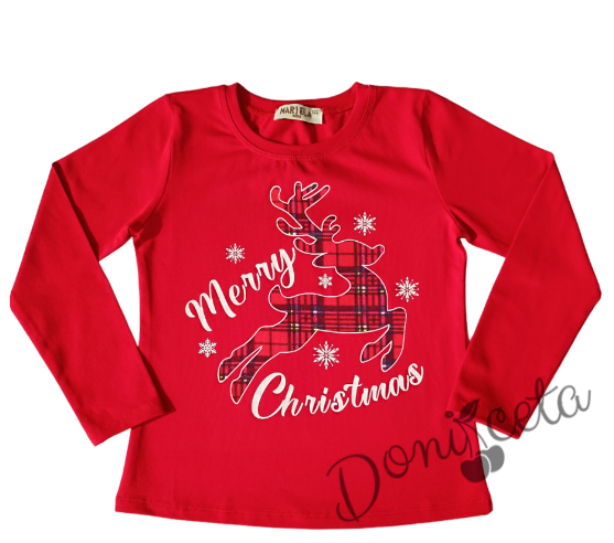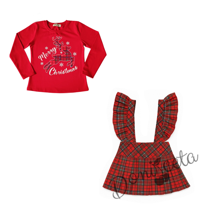 Комплект за момиче от блуза в червено с коледна картинка и сукман в каре