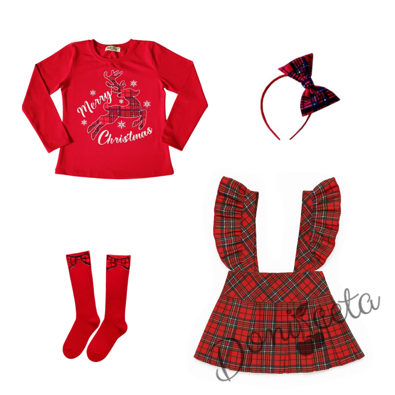 Подарете на вашето момиченце празнично настроение с този очарователен комплект за момиче, състоящ се от блуза с дълъг ръкав, сукман каре, червени чорапки и диадема с панделка в каре.