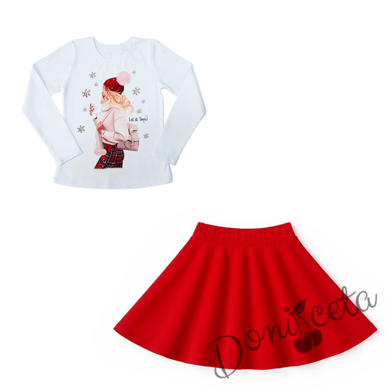 Комплект за момиче от 2 части-пола Роси в червено и блуза с дълъг ръкав в бяло с коледна картинка
