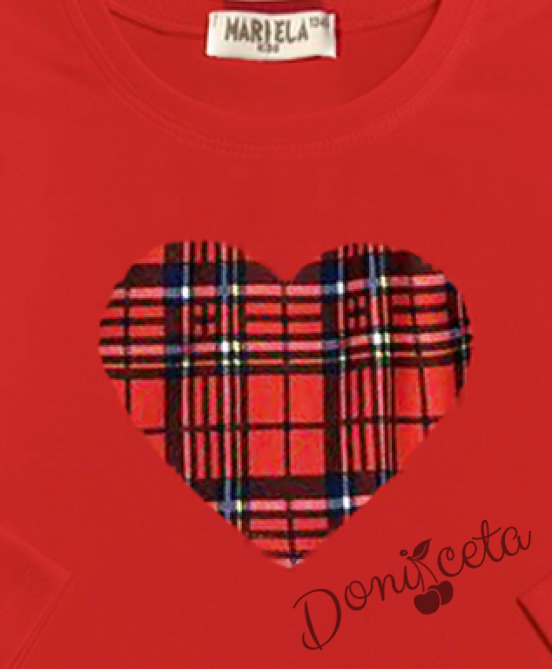Детска блуза с дълъг ръкав в червено с къдрици и сърце в каре