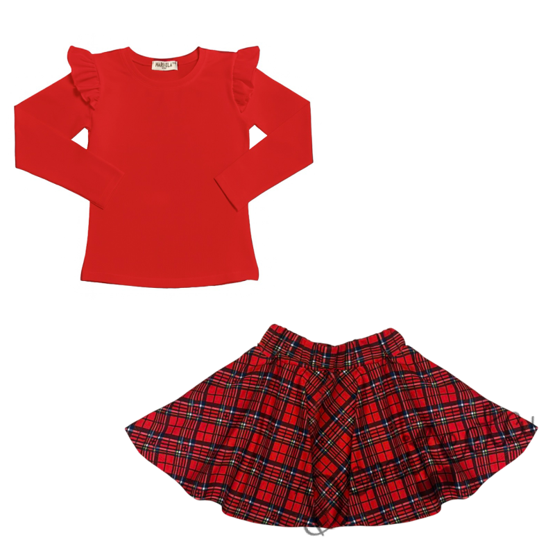 Комплект за момиче от 2 части-пола клош от трико Роси в каре и блуза с дълъг ръкав в червено с къдрички