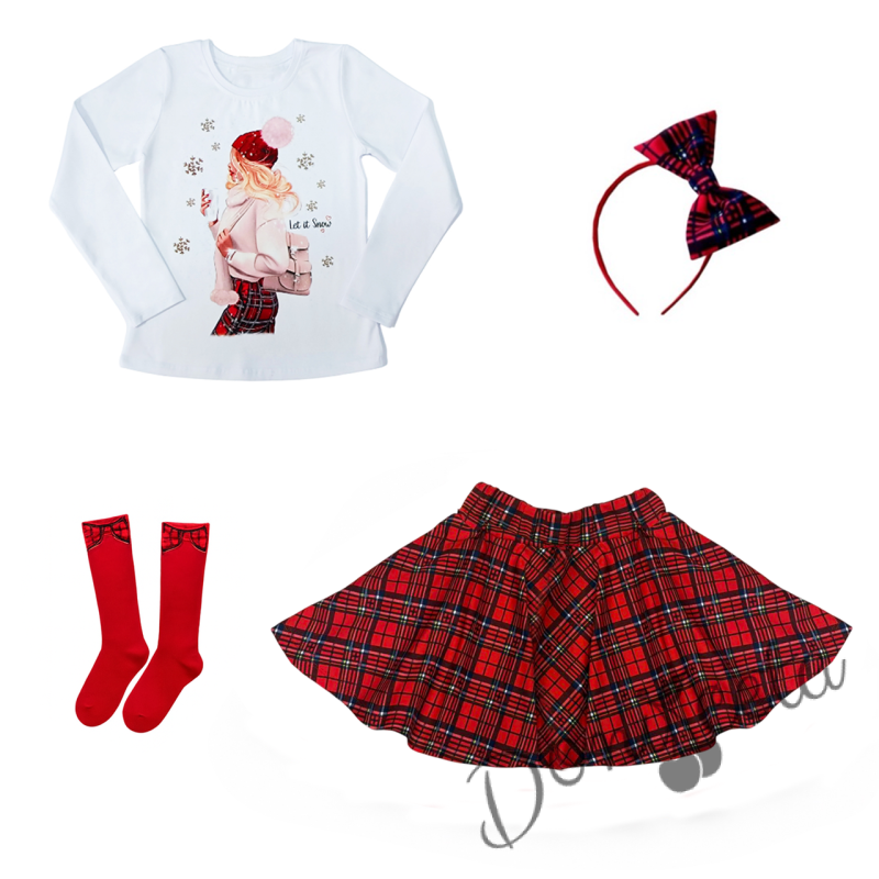 Комплект за момиче от 4 части-пола клош от трико Роси в каре, блуза с дълъг ръкав в бяло с коледна картинка, чорапи с панделка и диадема