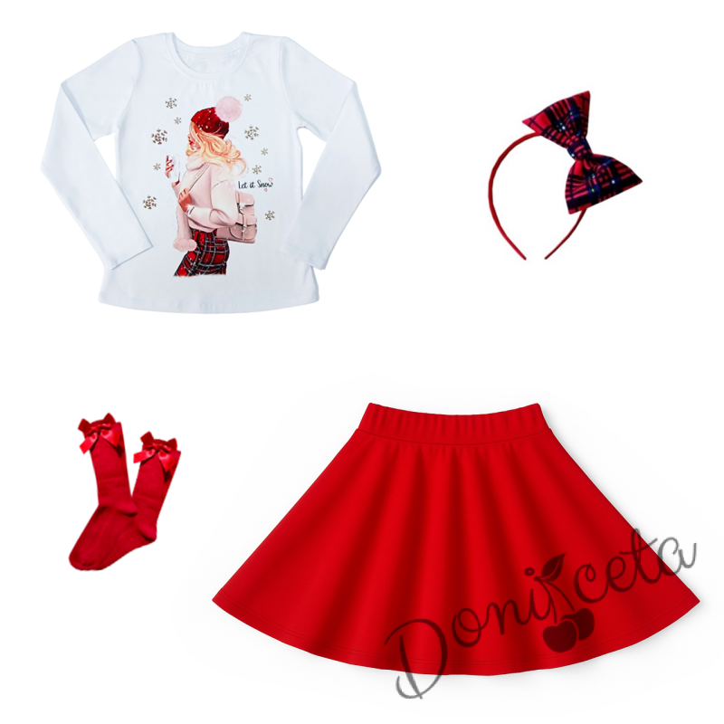 Комплект за момиче от 4 части-пола клош от трико Роси в червено, блуза с дълъг ръкав в бяло с коледна картинка, чорапи с панделка и диадема