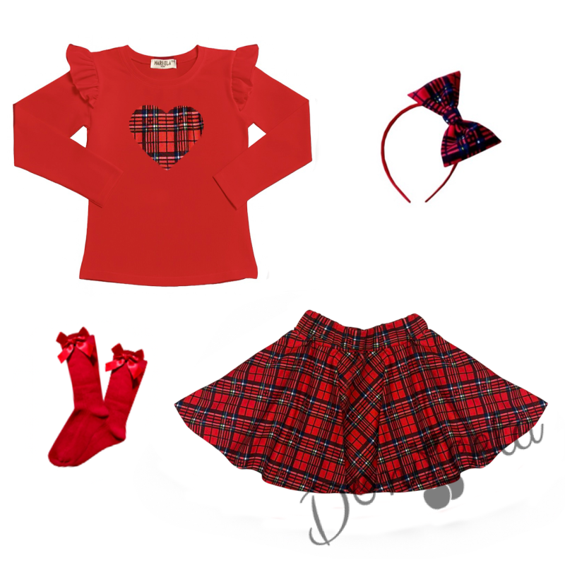 Комплект за момиче от 4 части-пола клош от трико Роси в каре, блуза с дълъг ръкав в червено със сърце в каре, чорапи с панделка и диадема