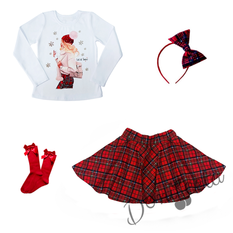 Комплект за момиче от 4 части-пола клош от трико Роси в каре, блуза с дълъг ръкав в бяло с коледна картинка, чорапи с панделка и диадема