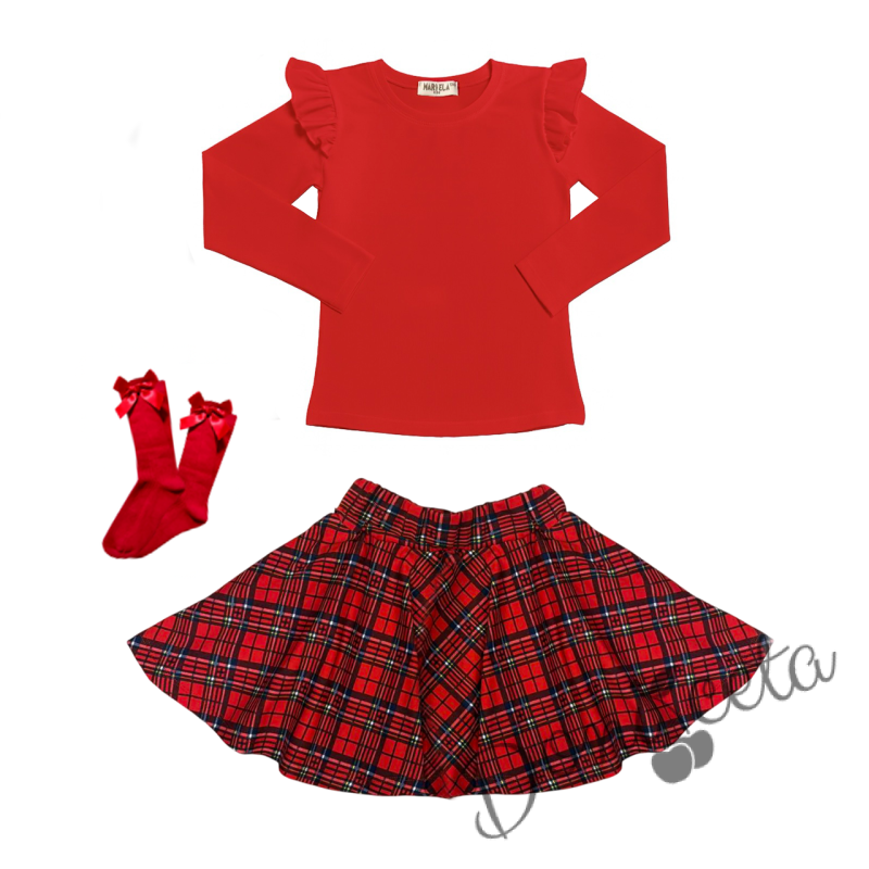 Комплект за момиче от 3 части-пола клош от трико Роси в каре, блуза с дълъг ръкав в червено с къдрички и чорапи с панделка