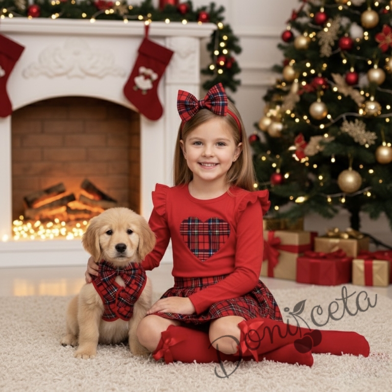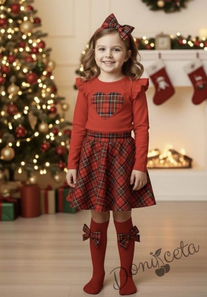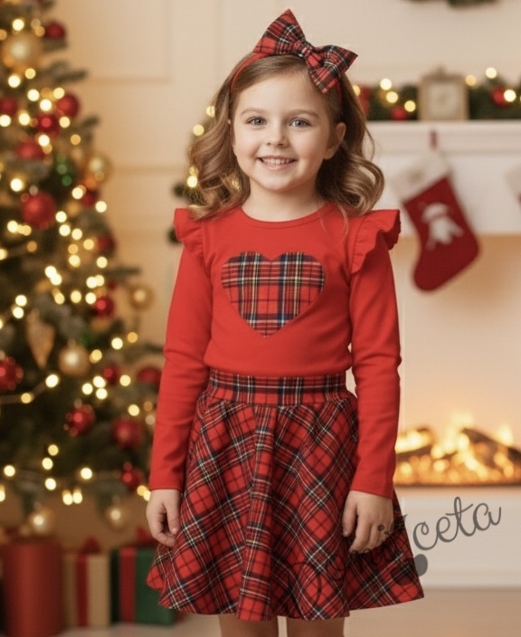Комплект за момиче от 2 части-пола клош от трико Роси в каре и блуза с дълъг ръкав в червено със сърце в каре Карена