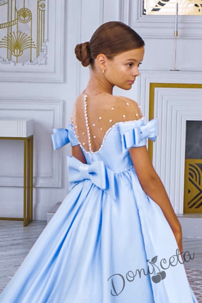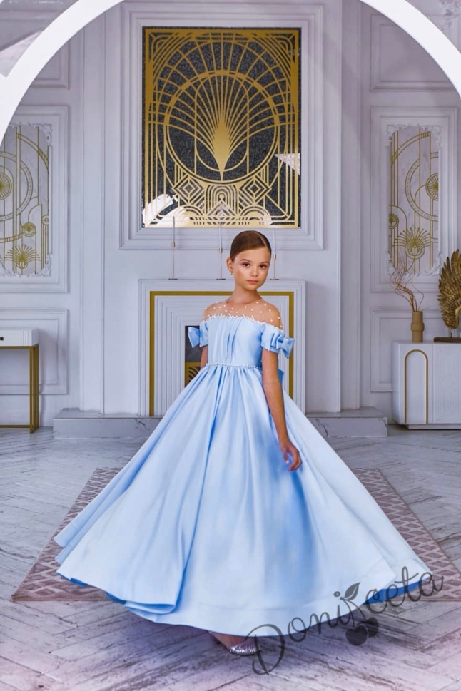 Официална дълга детска рокля в светлосиньо с перли и панделки Мая