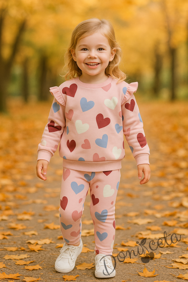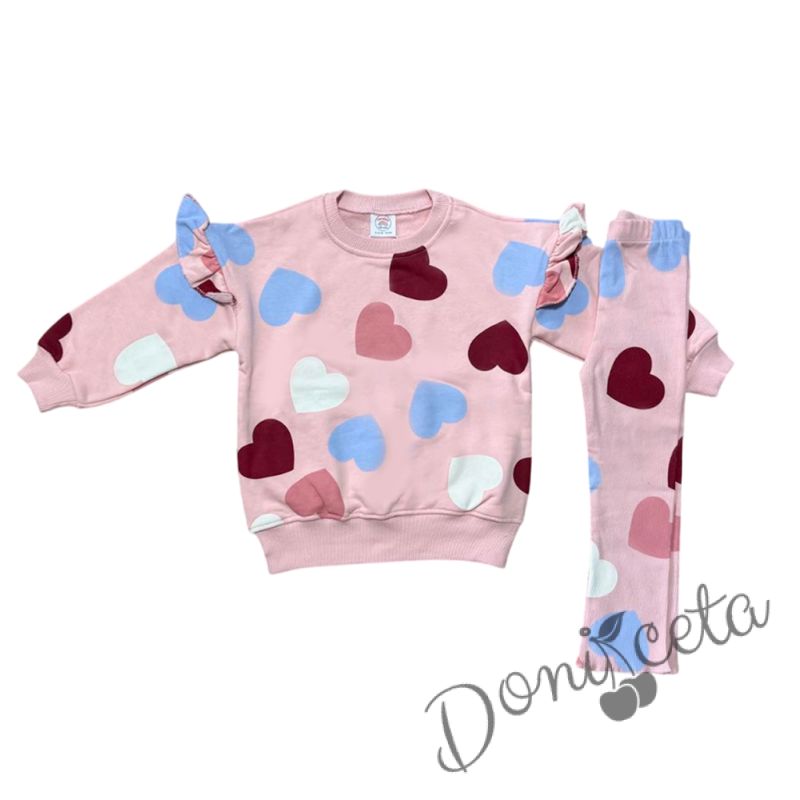 Очарователен комплект за малки принцеси! Изработен от мека и приятна на допир материя, този комплект включва удобна блузка с къдрички и клин. Дизайнът е в нежно розово с шарени сърчица в пастелни цветове, които придават свеж и игрив вид.