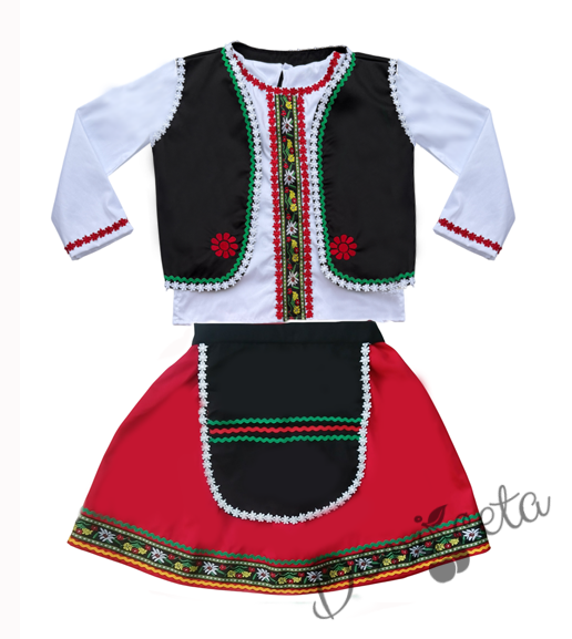 - Красив памучен фолклорен комплект за момиче от пола в червено, риза в бяло, престилка в черно и елек в черно с етно мотиви.