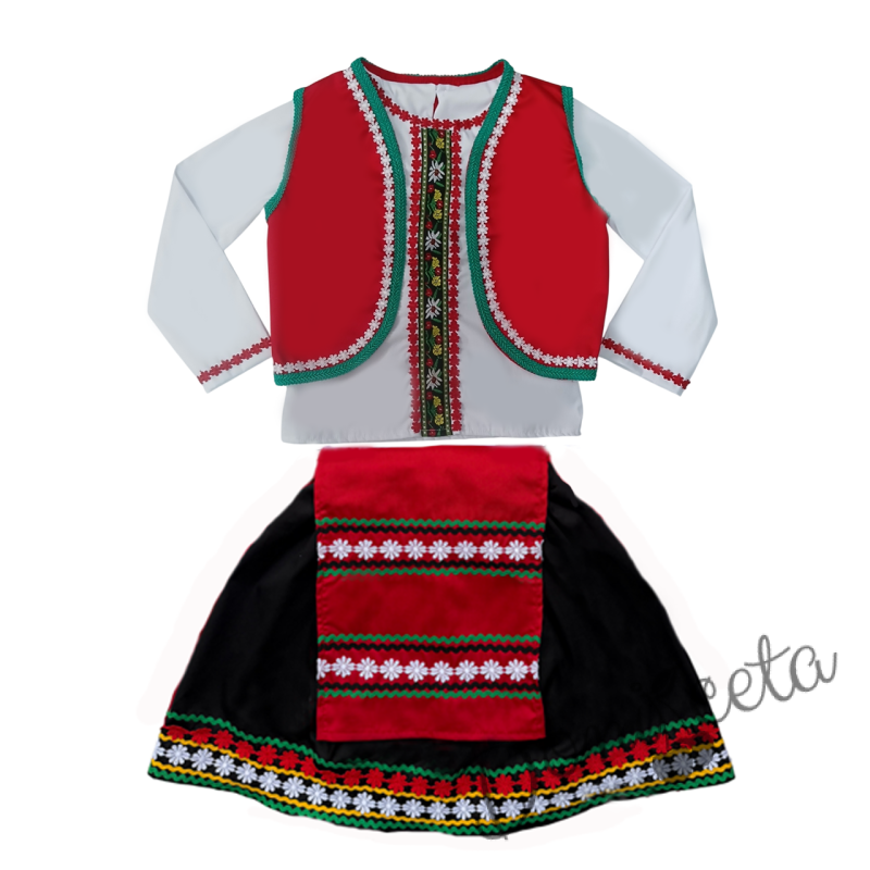 • Красив памучен фолклорен комплект за момиче от пола в черно, риза в бяло, престилка в червено и елек в червено с етно мотиви.