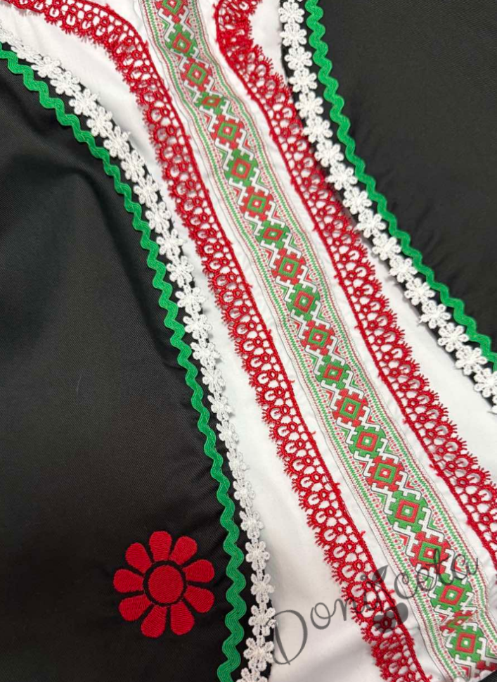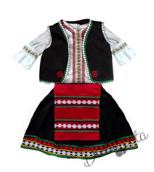 - Красив памучен фолклорен комплект за момиче от пола в черно, риза в бяло, престилка в червено и елек в черно с етно мотиви.