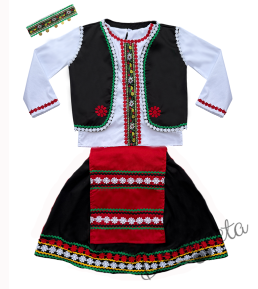 - Красив памучен фолклорен комплект за момиче от пола в черно, риза в бяло, престилка в червено и елек в черно с етно мотиви.