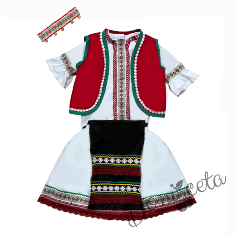 • Красив памучен фолклорен комплект за момиче от пола в бяло, риза в бяло, престилка в черно и елек в червено с етно мотиви.