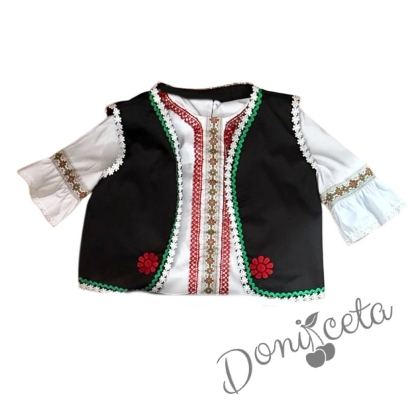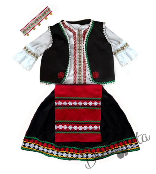 - Красив памучен фолклорен комплект за момиче от пола в черно, риза в бяло, престилка в червено и елек в черно с етно мотиви.