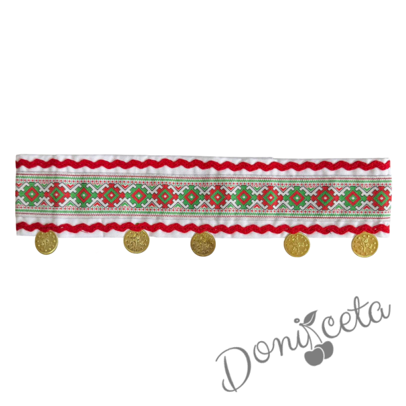 Дамска или детска народна носия 62 с косичник за глава-риза, пола, елек, косичник и червена престилка с фолклорни/етно мотиви