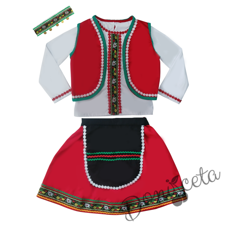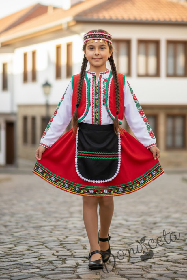- Красив памучен фолклорен комплект за момиче от пола в червено, риза в бяло, престилка в черно и елек в червено с етно мотиви.