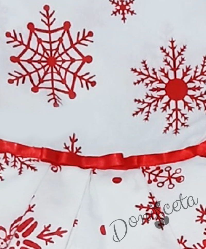 Официална детска коледна рокля Надежда тип клош с тюл в бяло на червени снежинки