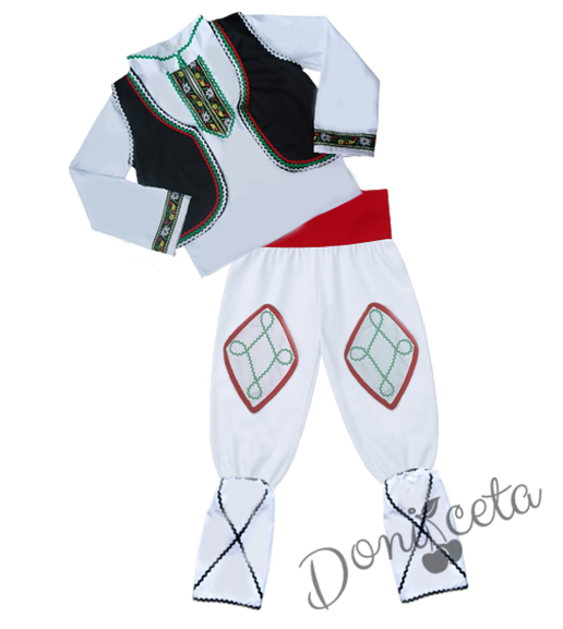 Мъжка или детска народна носия за момче 101 с фолклорни/етно мотиви, с елек и пояс в червено и гети
