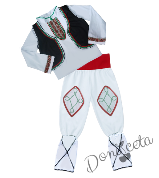 Мъжка или детска народна носия за момче 103 с фолклорни/етно мотиви, с елек и пояс в червено и гети
