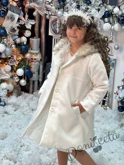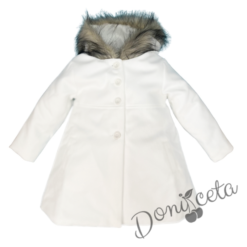 • Топло и стилно палто в бяло за момиче за зимата с качулка и джобчета.