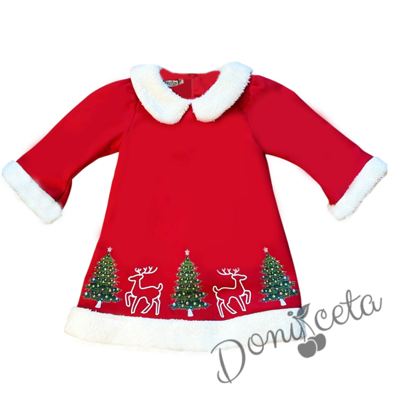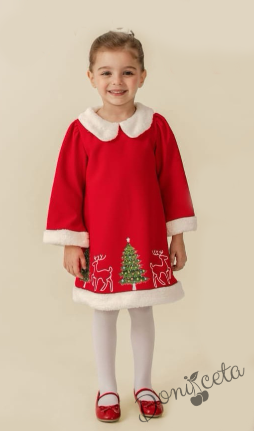Коледна детска рокля в червено с плюш и коледни мотиви