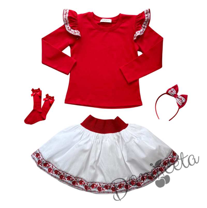 Комплект за момиче от 4 части-пола в бяло, блуза в червено с къдрици с фолклорни/етно мотиви, чорапи с панделка и диадема