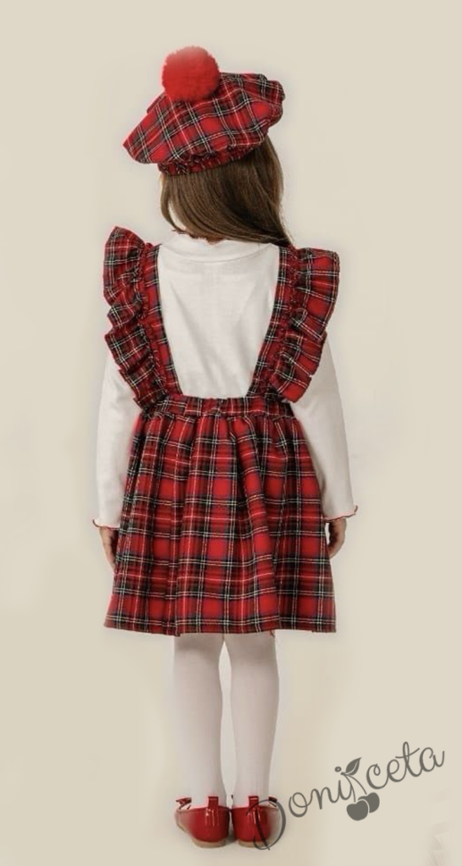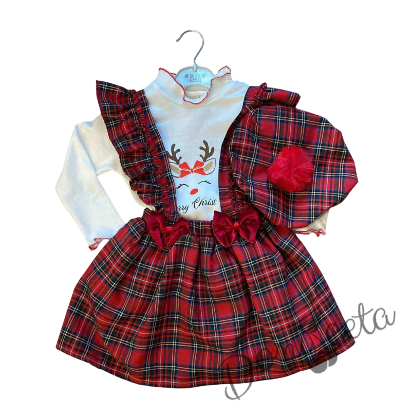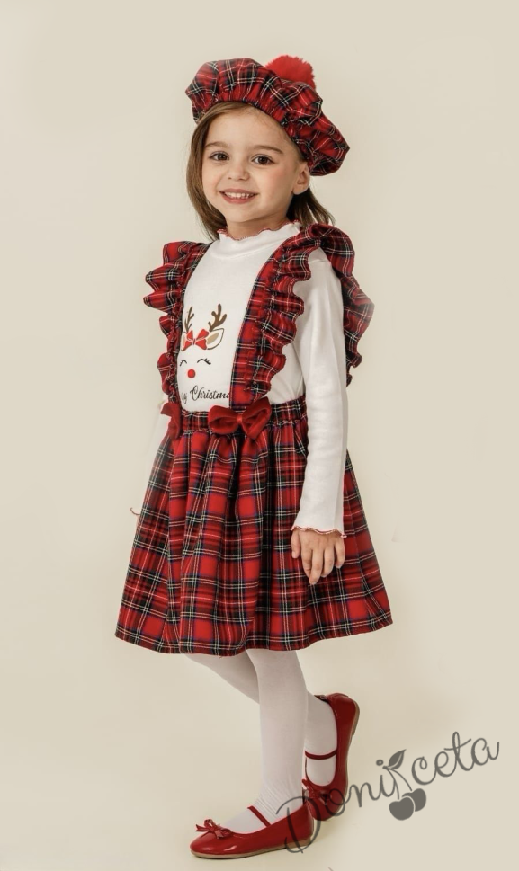 Коледен детски комплект за момиче от сукман в каре с панделки, блузка в бяло с къдрички и еленче и барета в каре с пух