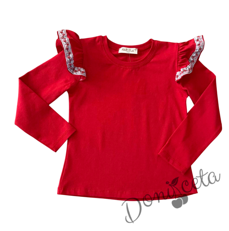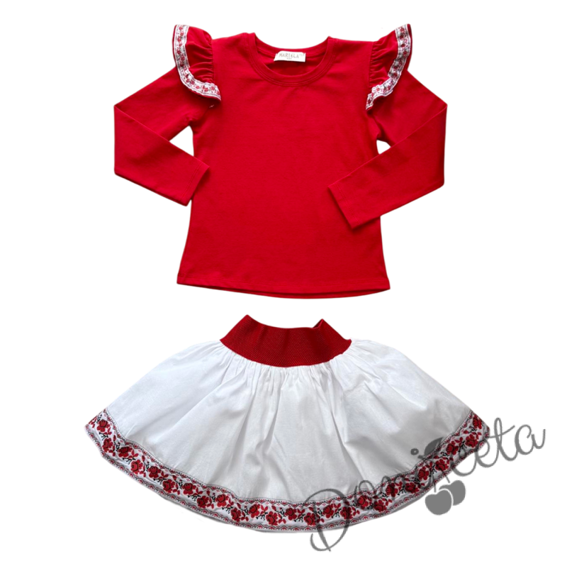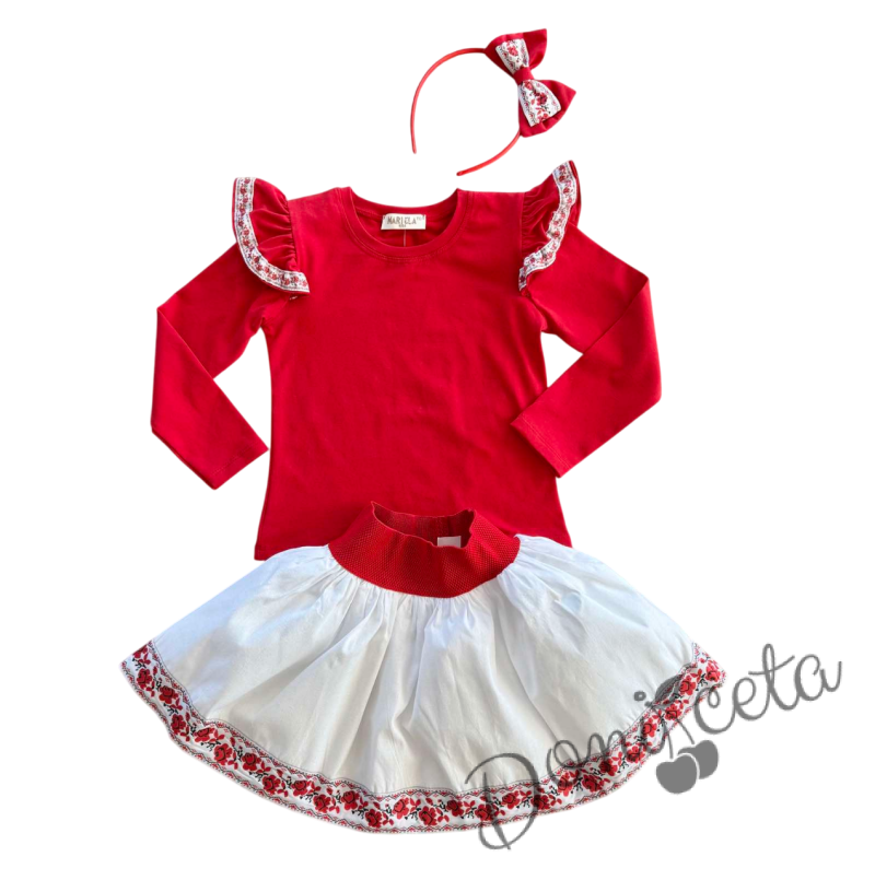 Комплект за момиче от 3 части-пола в бяло, блуза в червено с къдрици с фолклорни/етно мотиви и диадема