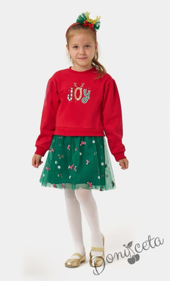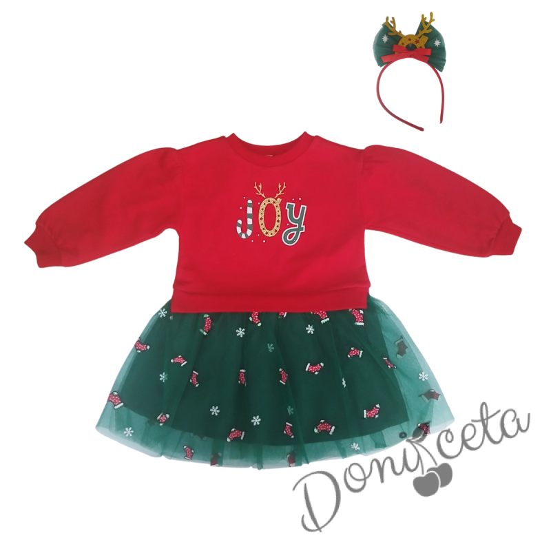 Детска коледна ватирана рокля в червено с тюл в зелено с коледни мотиви и диадема