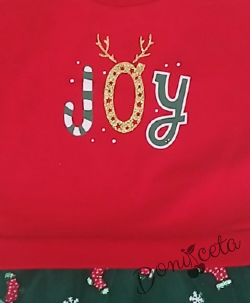 Подарете празнично настроение на вашето дете с този очарователен коледен комплект! Комплектът включва рокля с весел коледен дизайн.За завършена визия е добавена и тематична диадема с тюл и златна украса – перфектен завършек за празничния тоалет.
