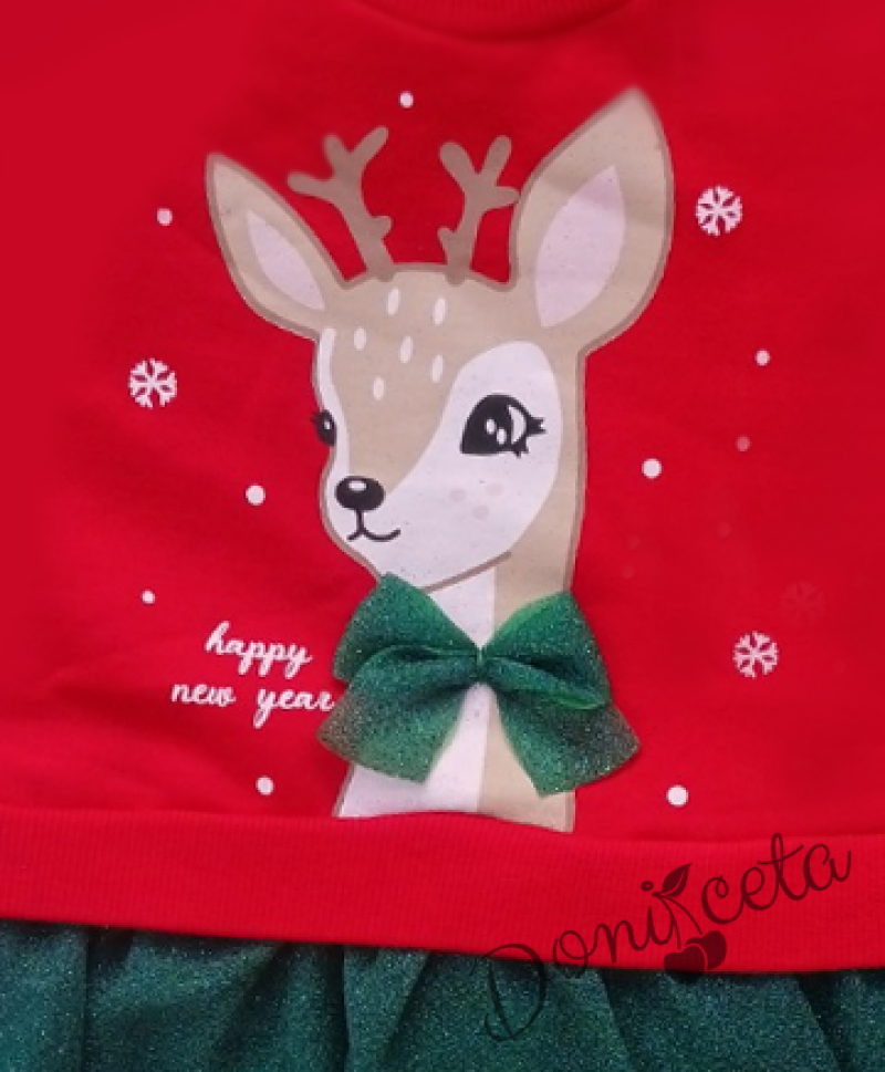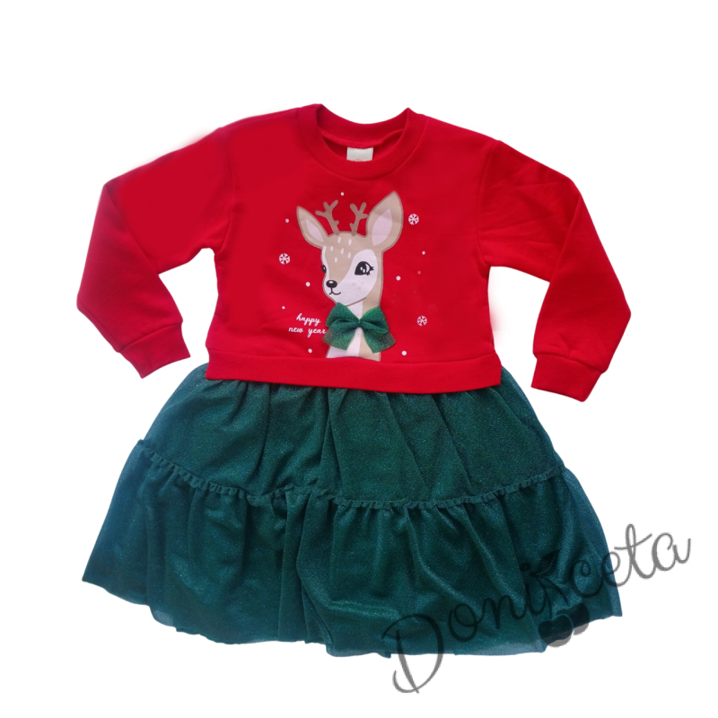 Детска коледна ватирана рокля в червено с картинка на еленче с блестящ тюл в зелено