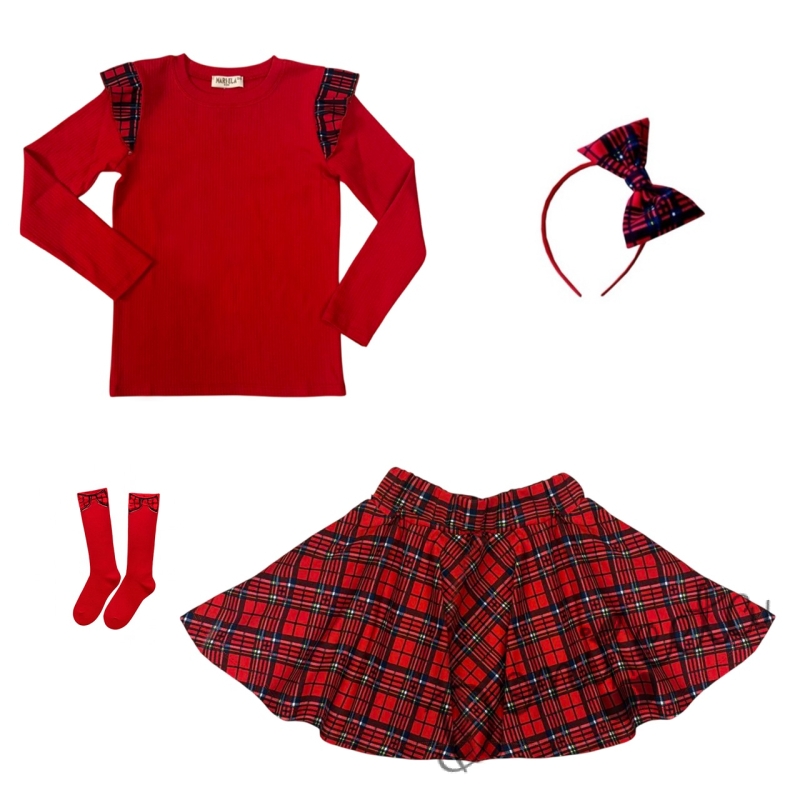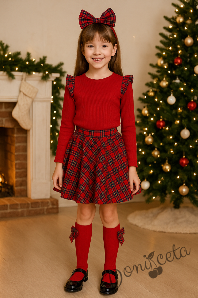 Комплект от 4 части за момиче - пола клош от трико Роси в каре, блуза с дълъг ръкав в червено с каре къдрички, чорапи с панделка каре и диадема