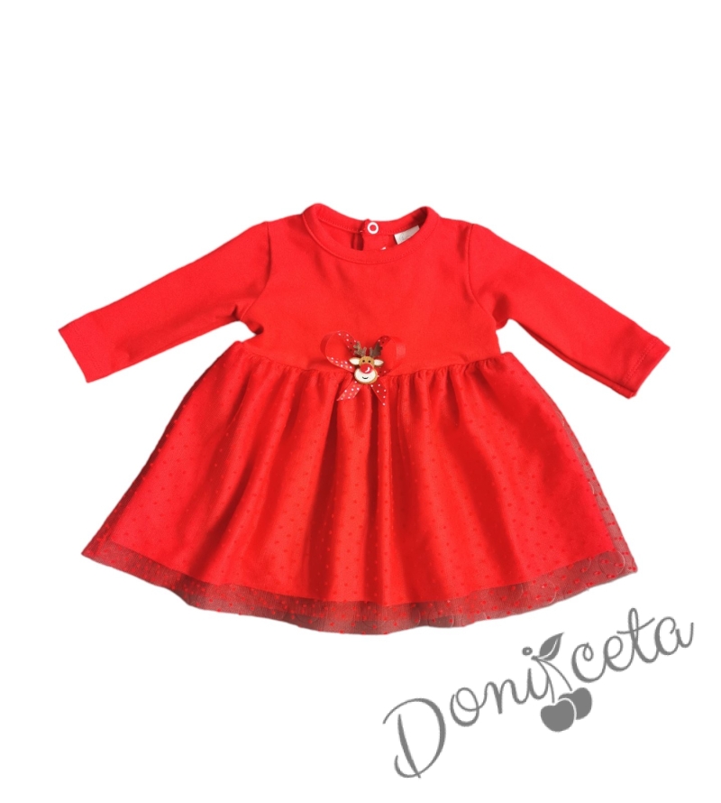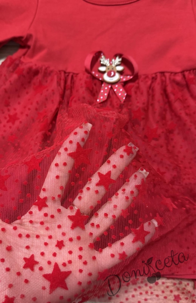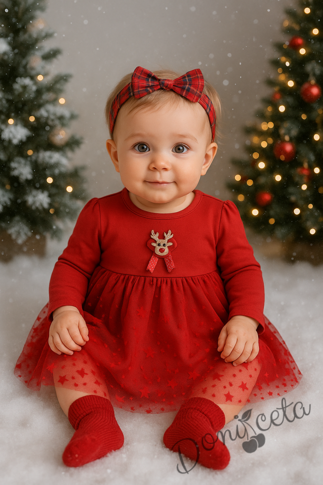 Бебешка/детска коледна рокля в червено с дълъг ръкав с еленче и тюл на звездички
