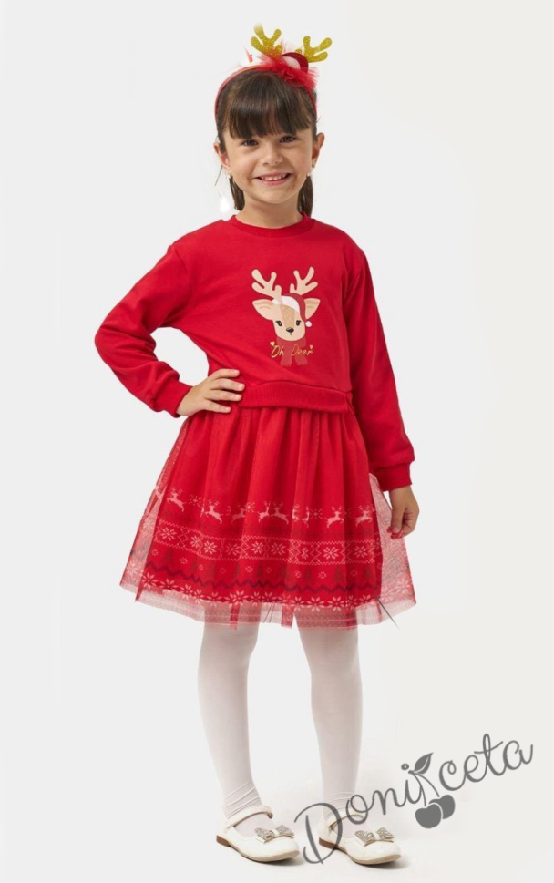 Начало МОМИЧЕТА Детска коледна ватирана рокля в червено с картинка на еленче с тюл в червено с коледни мотиви
