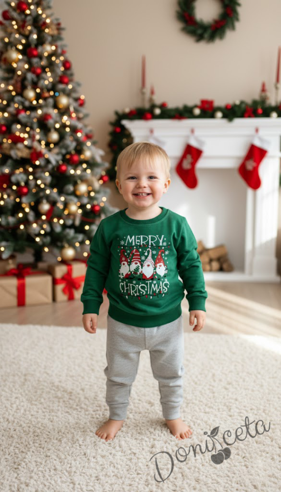 Ватиран коледен детски комплект от блуза в сиво с Дядо Коледа и шейна и долнище в зелено с връзки