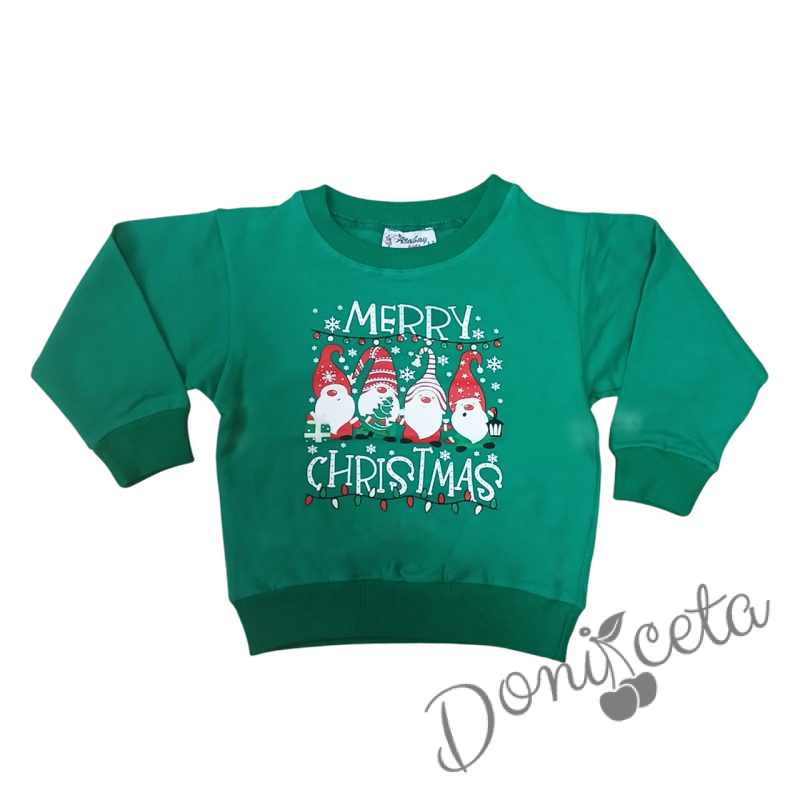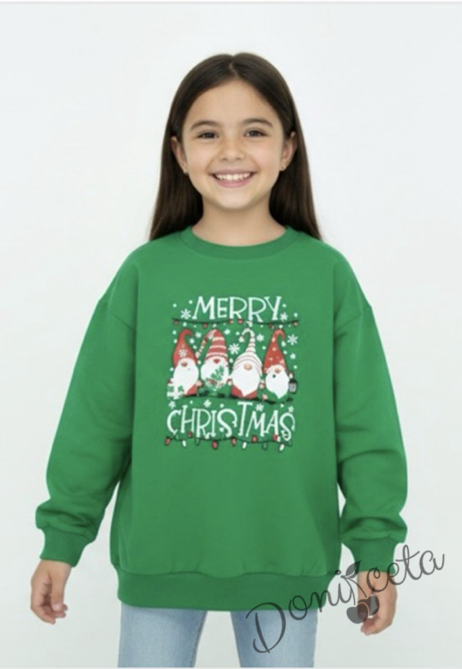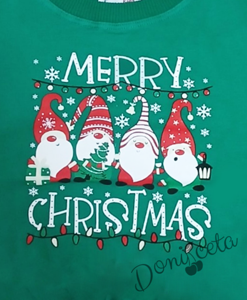 Детска коледна блуза за момиче в зелено със сладка картинка на джуджета и надпис