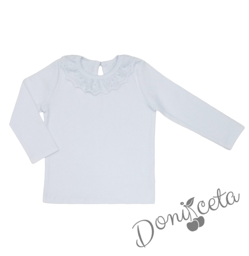 Детска рипсана блуза с дълъг ръкав в бяло с дантела