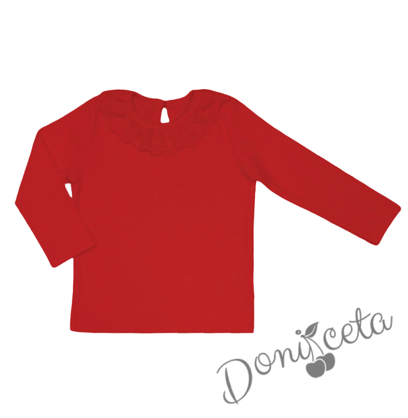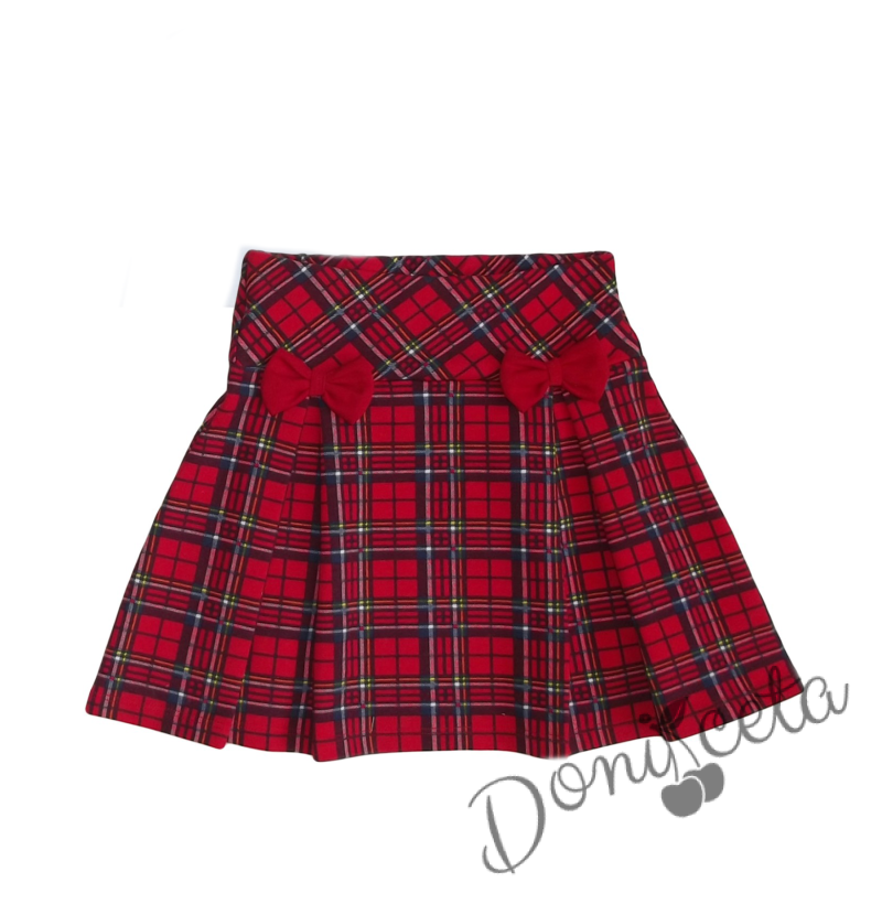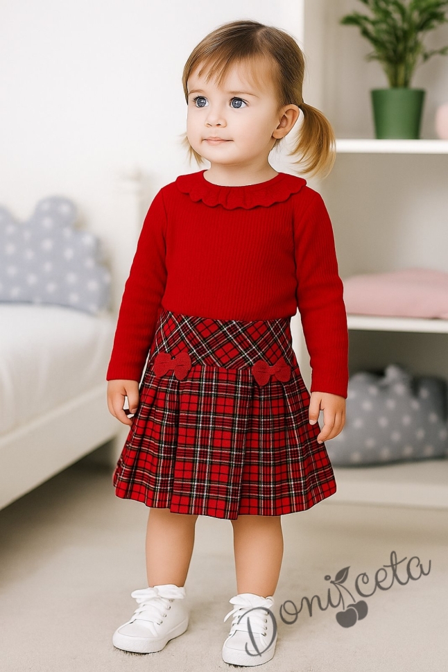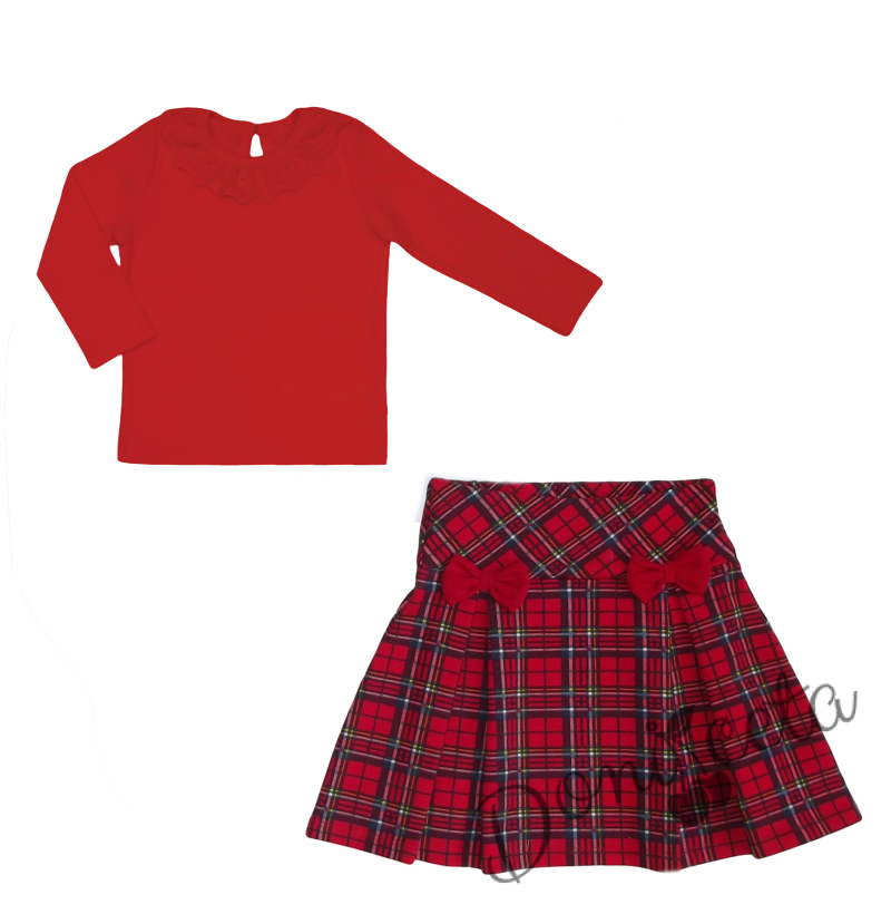 Комплект за момиче от 2 части-пола Вили в каре с панделки и блуза с дълъг ръкав в червено с дантела