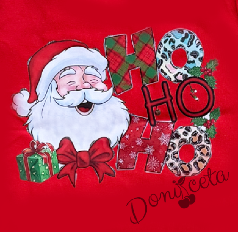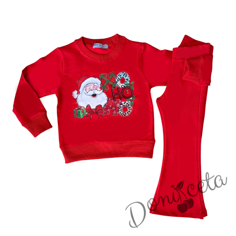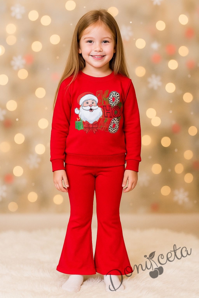 Коледен комплект за момиче от ватирана блуза в червено с коледна картинка и панталон тип чарлстон в червено