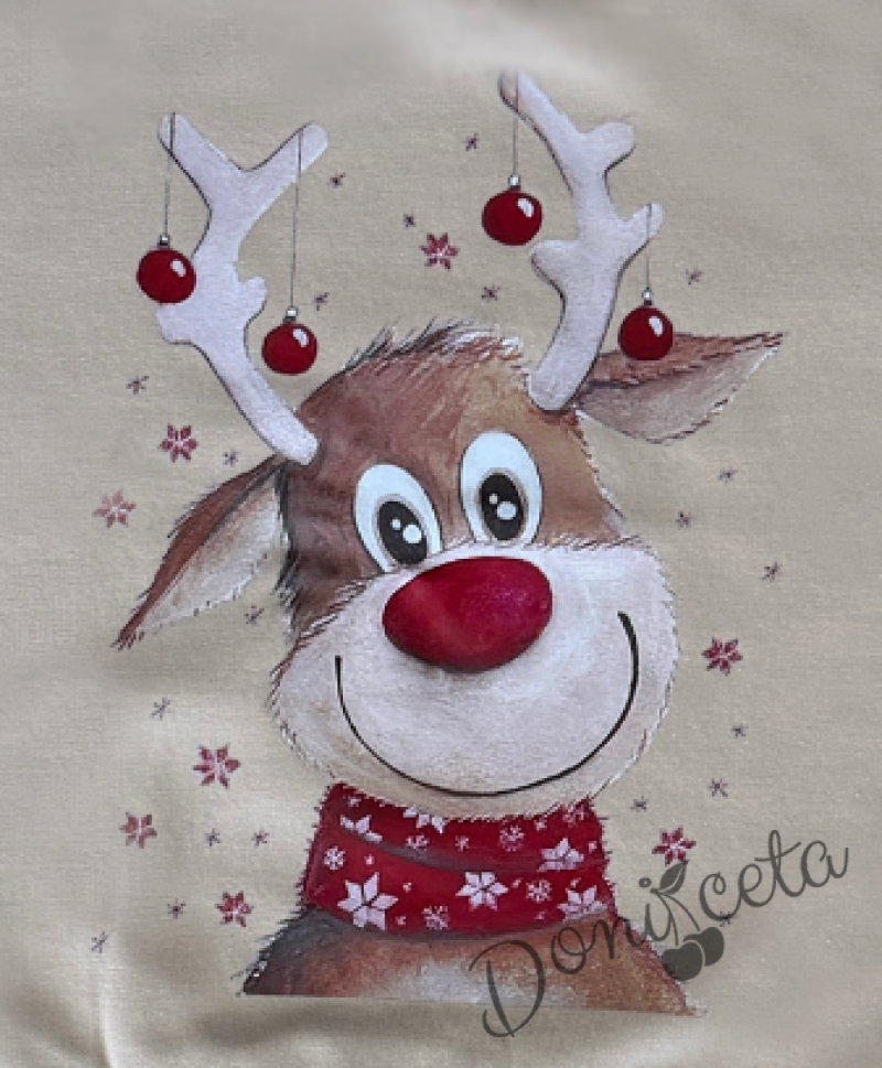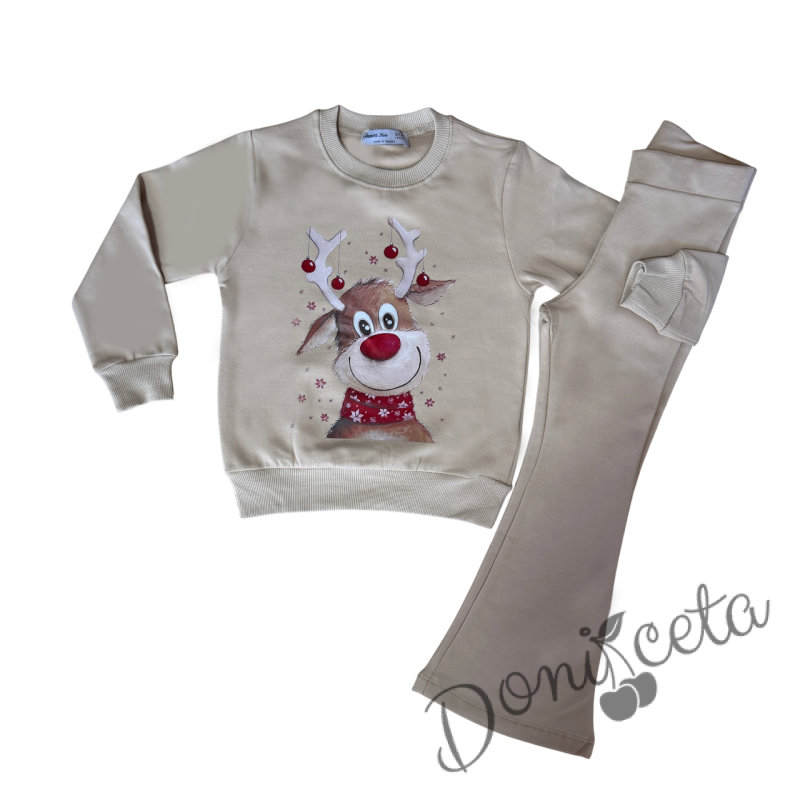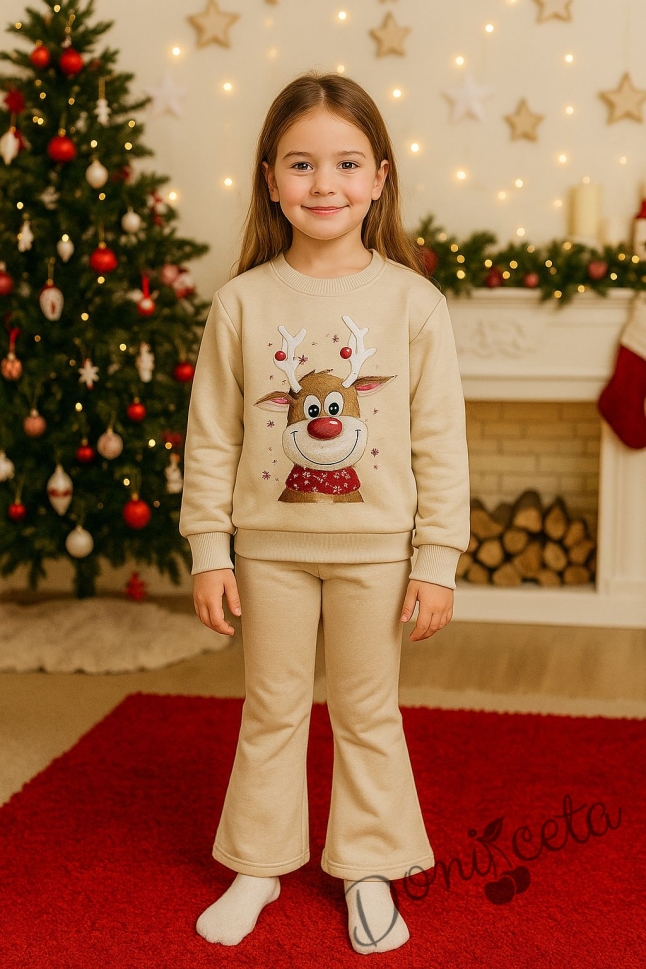 Коледен комплект за момиче от ватирана блуза в бежово с коледна картинка и панталон тип чарлстон в бежово