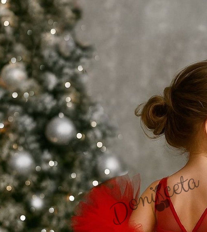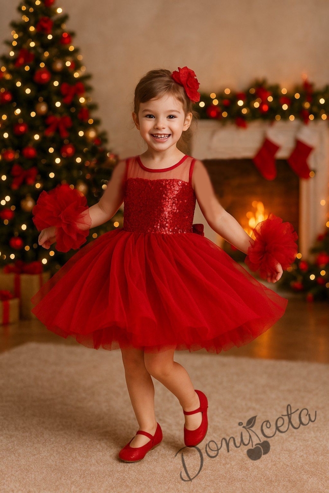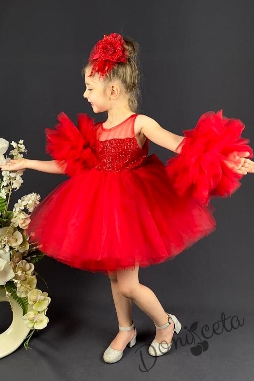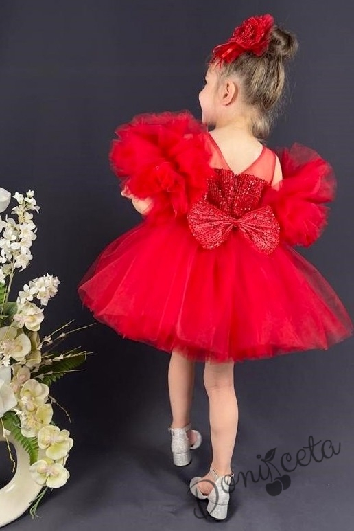 Официална детска рокля Блян с богат тюл в червено с блясък и панделка за коса