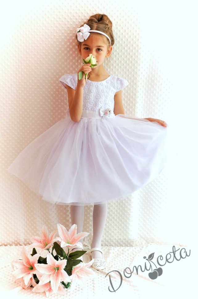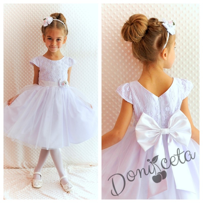Изключително красива детска рокля за малки и големи принцеси в бяло. Рокличката е с много нежна дантела в горната част и красив тюл надолу. Отзад е с голяма панделка. На кръста е с коланче и има красиво цвете. Горната част е с памучна подплата отвътре. Рокличката е подходяща за официални поводи-сватби, кръщенета, рождени дни! В нея всяко момиченце ще се почувства като истинска принцеса! *Моля имайте предвид, че цената се променя според размера!