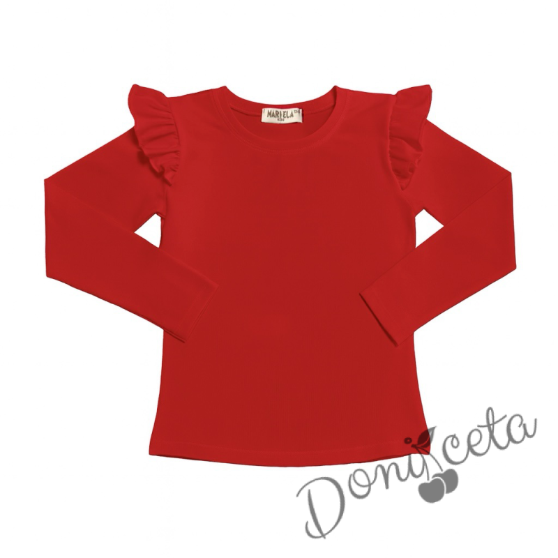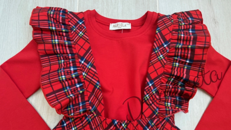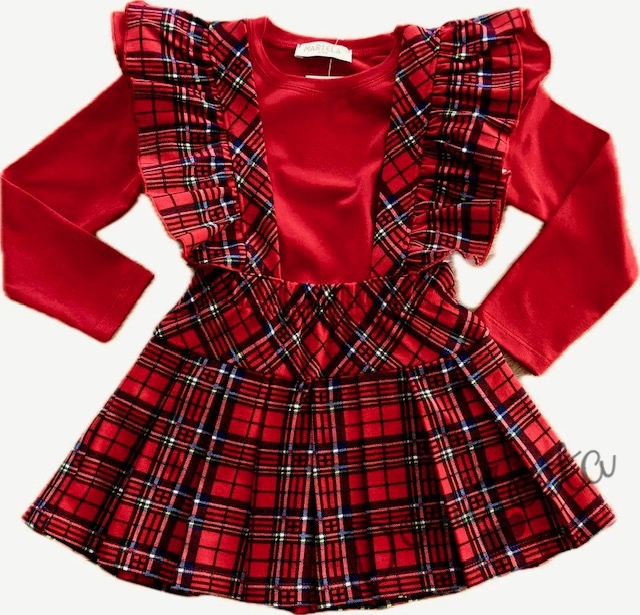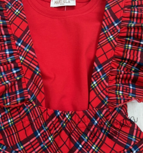 Подарете на вашето момиченце празнично настроение с този очарователен комплект за момиче, състоящ се от блуза с дълъг ръкав в червено с къдрички и сукман в каре.