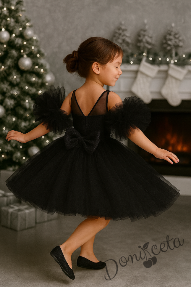 - Стилна детска къса рокля в черно с тюл в долната част и в горната с пайети и голяма панделка отзад.