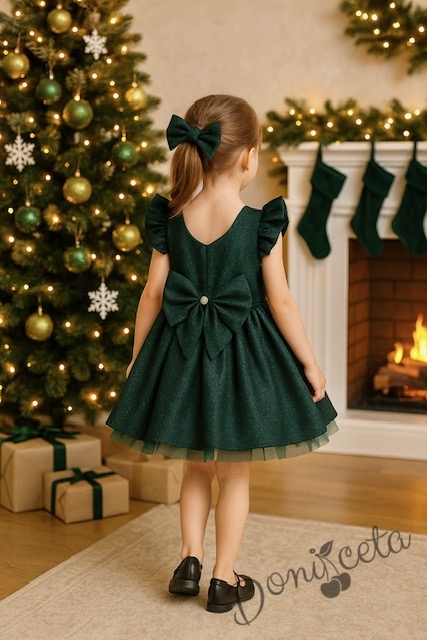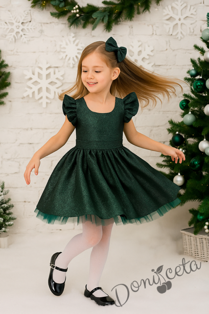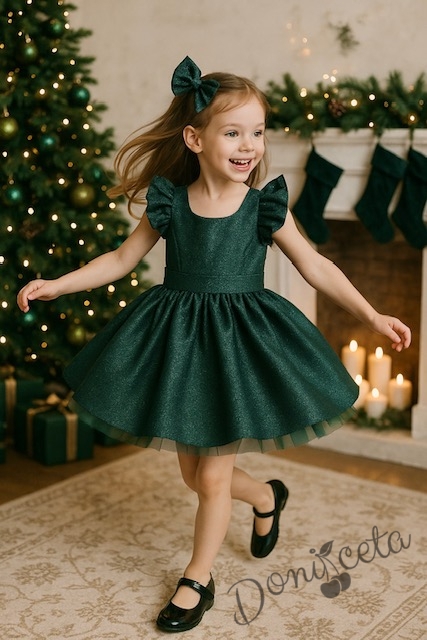 Официална детска рокля с къс ръкав с брокат в тъмнозелено с тюл с панделка и фиба с панделка