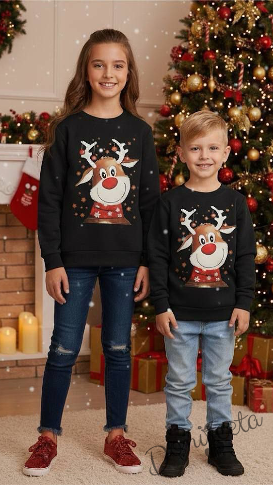 - Весела ватирана коледна блузка в черно с елен отпред с рога и шалче.