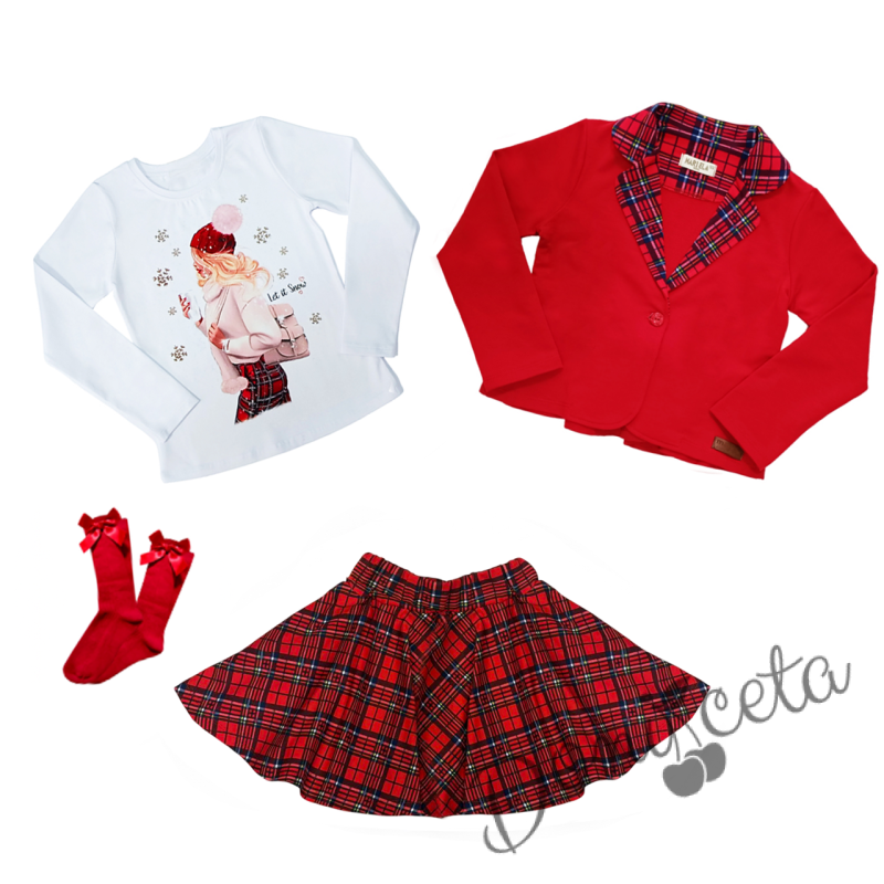 Комплект за момиче от 4 части-сако в каре, пола клош от трико Роси в каре, блуза с дълъг ръкав в бяло с коледна картинка и чорапи с панделка